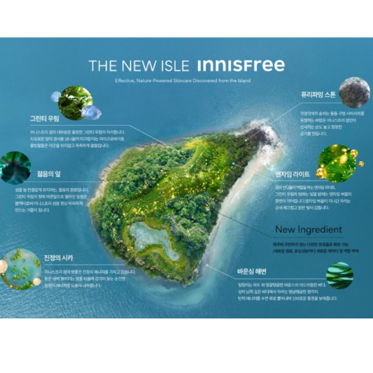 새로운 브랜드 슬로건과 함께 소개된 이니스프리의 ‘THE NEW ISLE’은 브랜드의 대표 제품들에 사용되는 자연 친화적인 원료가 살아 숨 쉬는 섬을 상징합니다!