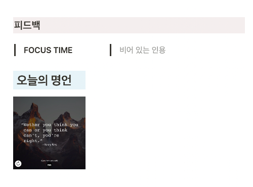 월별로 노션 위젯을 활용한 명언을 불러올 수 있습니다. 인스타그램과 연동되어 있어 업데이트할 필요없이 긍정적인 명언과 함께 미라클 모닝 해보세요!